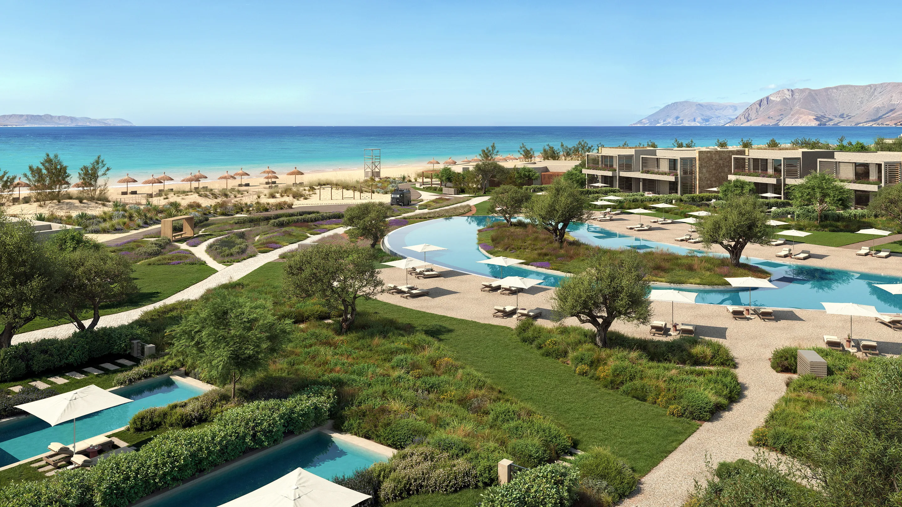More like a Greek village retreat designed for families, couples and friends to come together than a traditional resort, days here unfold in an easy sense of adventure. Rooms and suites echo their surroundings with earthy tones and natural materials, many with private pools and views that reach across a sweep of green landscapes to the sea and mountains beyond. Laidback luxury unfurls between nearly 600 metres of golden beach and a stretch of verdant gardens to explore – an active getaway is a guarantee (for those who want it) with eight heated pools, paddle courts, yoga decks and water sports in the warmth of the Aegean.