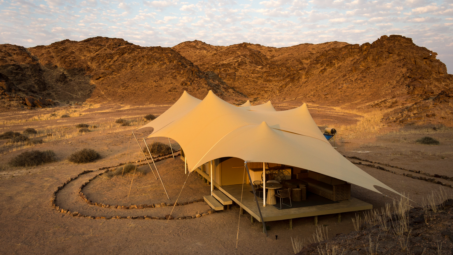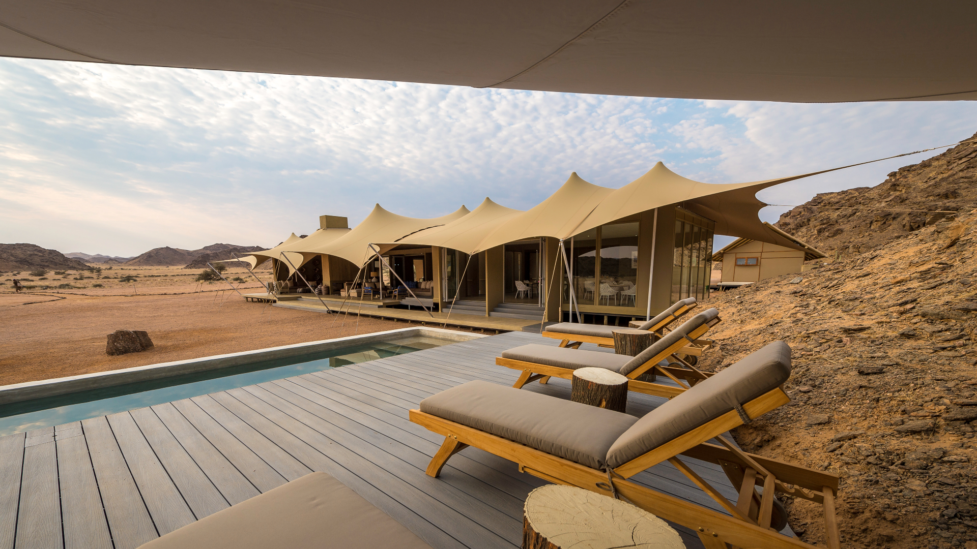 Meeting them is like stepping into a unique time capsule. They share their stories of survival in such a harsh climate, working the land for crops and tracking animals. The latter can be put into action with the help of a guide; endangered rhino and a myriad of other desert dwellers can be sought out the Herero way. Afterwards, tall tales can be told after dark around the torch-lit camp fire or by morning on the deck of the plunge pool.